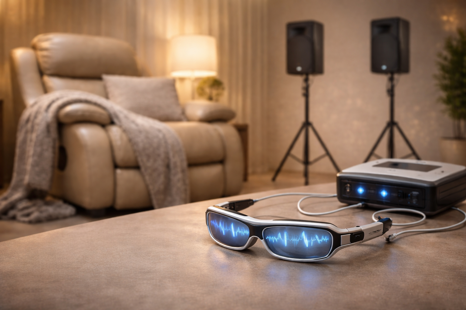 You’ll relax in a comfortable chair. Soft entrainment audio plays, and you’ll wear light-pulse glasses with eyes closed the entire time. I’ll guide you through targeted hypnosis to install the changes you want.